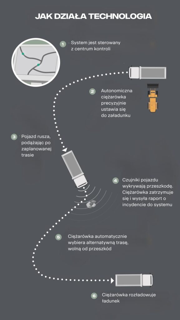 • Autonomiczny transport pozwala lepiej rozłożyć obowiązki wśród kierowców – długie, monotonne odcinki można powierzyć maszynie, a człowiek może skupić się na operacjach specjalnych i krótkich trasach.