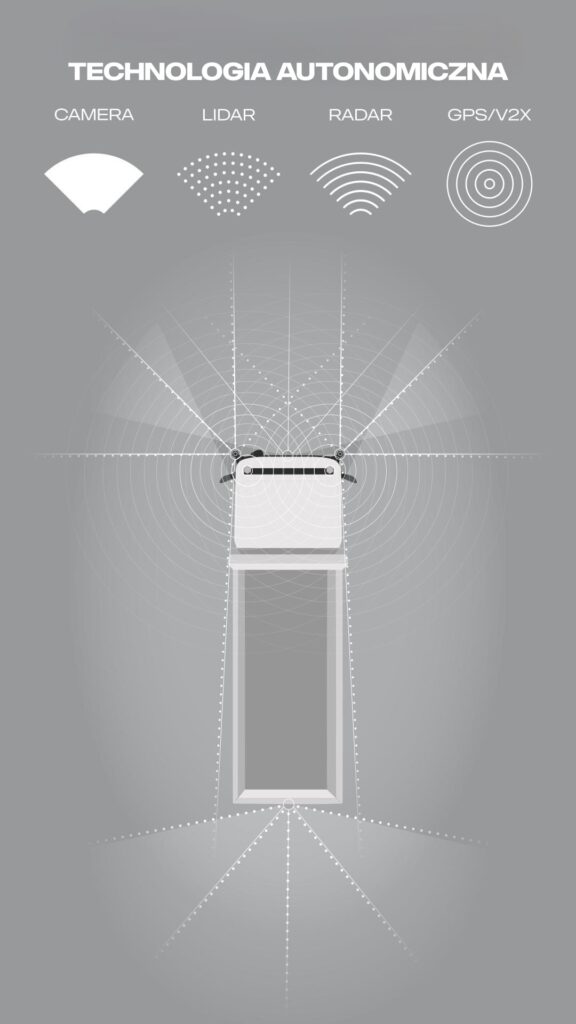 • LIDAR, RADAR i GPS, które zapewniają ciągłe „widzenie” otoczenia – nie tylko przed, ale i po bokach pojazdu.