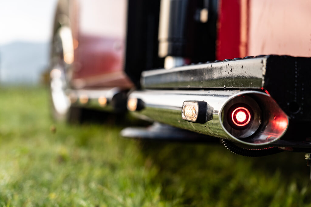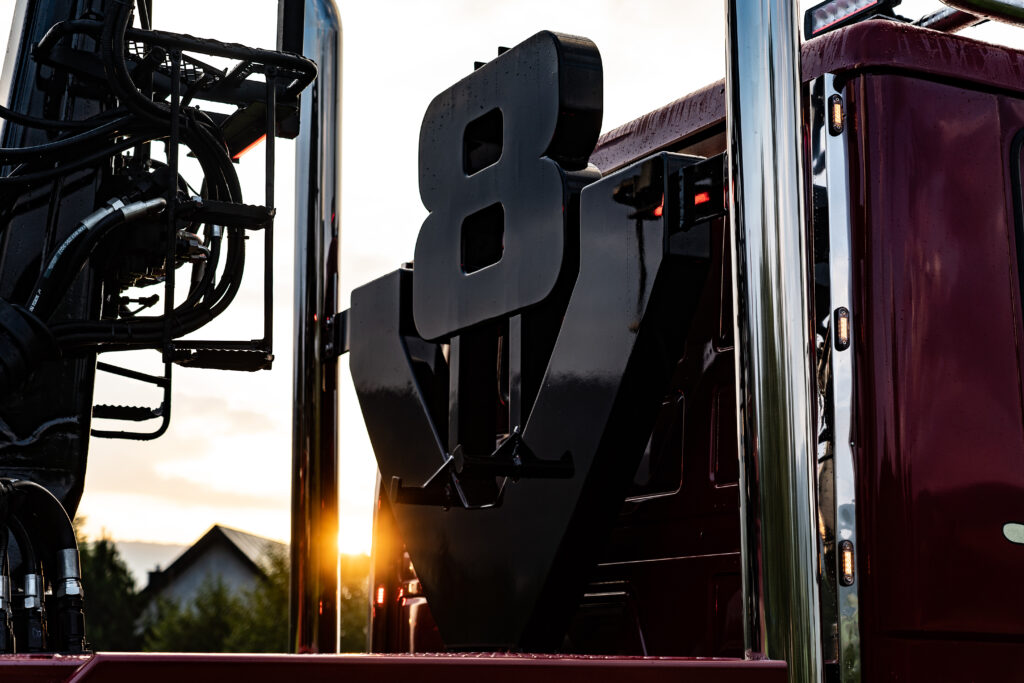 Dodatkowo, za kabiną, między podwójnymi, pionowo ustawionymi rurami wydechowymi, umieszczono charakterystyczny emblemat „V8”.