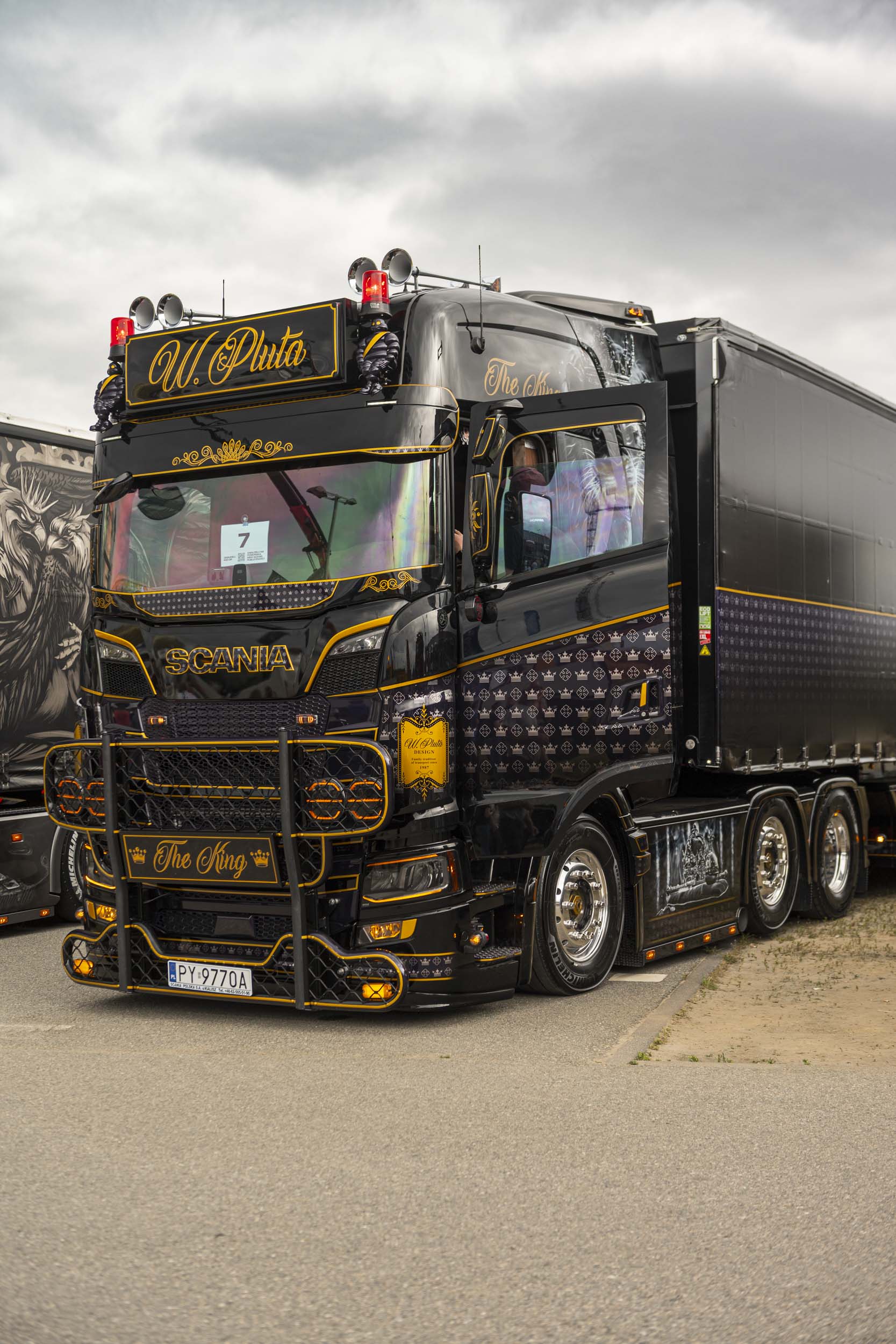 Tytuł główny „Pomorska Miss Scania 2025” trafił w ręce Waldemara Pluty, właściciela imponującej ciężarówki Scania 770S „The King”. Ten trzyosiowy ciągnik z kabiną Highline to hołd dla współczesnej klasy premium. Detale zewnętrzne pojazdu tworzą spójną całość z naczepą, która sama w sobie jest manifestem stylu.