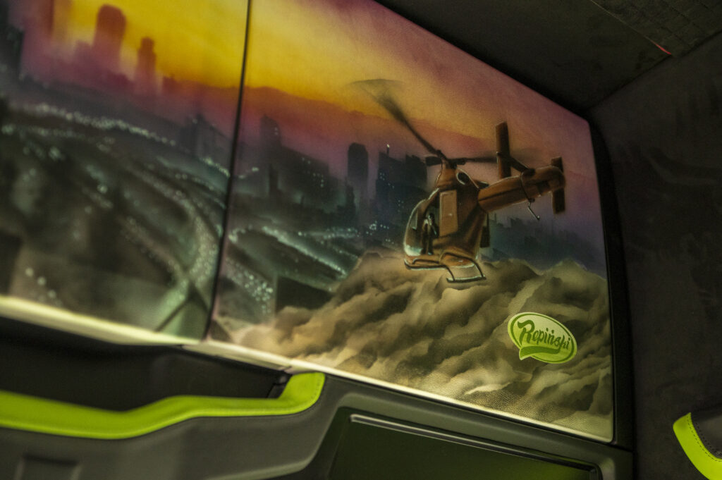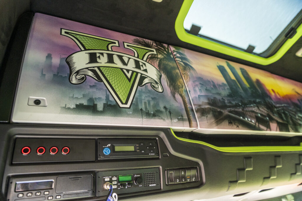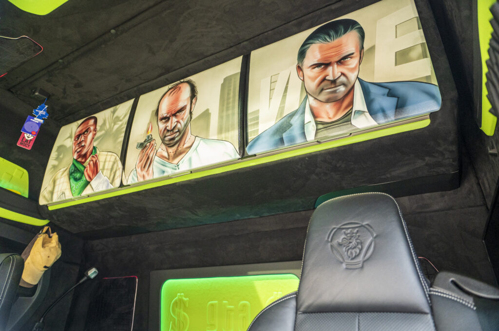 – Pojazd, który tu widzimy, to Scania 560S z motywem GTA V, wykonanym u nas na warsztacie przez naszych lakierników. Malowanie jest nałożone aerografem. Niektórzy myślą, że to są naklejki, ale u nas wszystko jest wykonane ręcznie. Środek został stworzony w całości w firmie TapCar Żukowo. Wnętrze jest czarno-zielone, dosyć jaskrawe, ale mnie się podoba. Scania została ukończona w tym roku i była dla mnie miłą niespodzianką. Szefostwo firmy przekazało mi ją 1 czerwca, czyli w Dzień Dziecka.